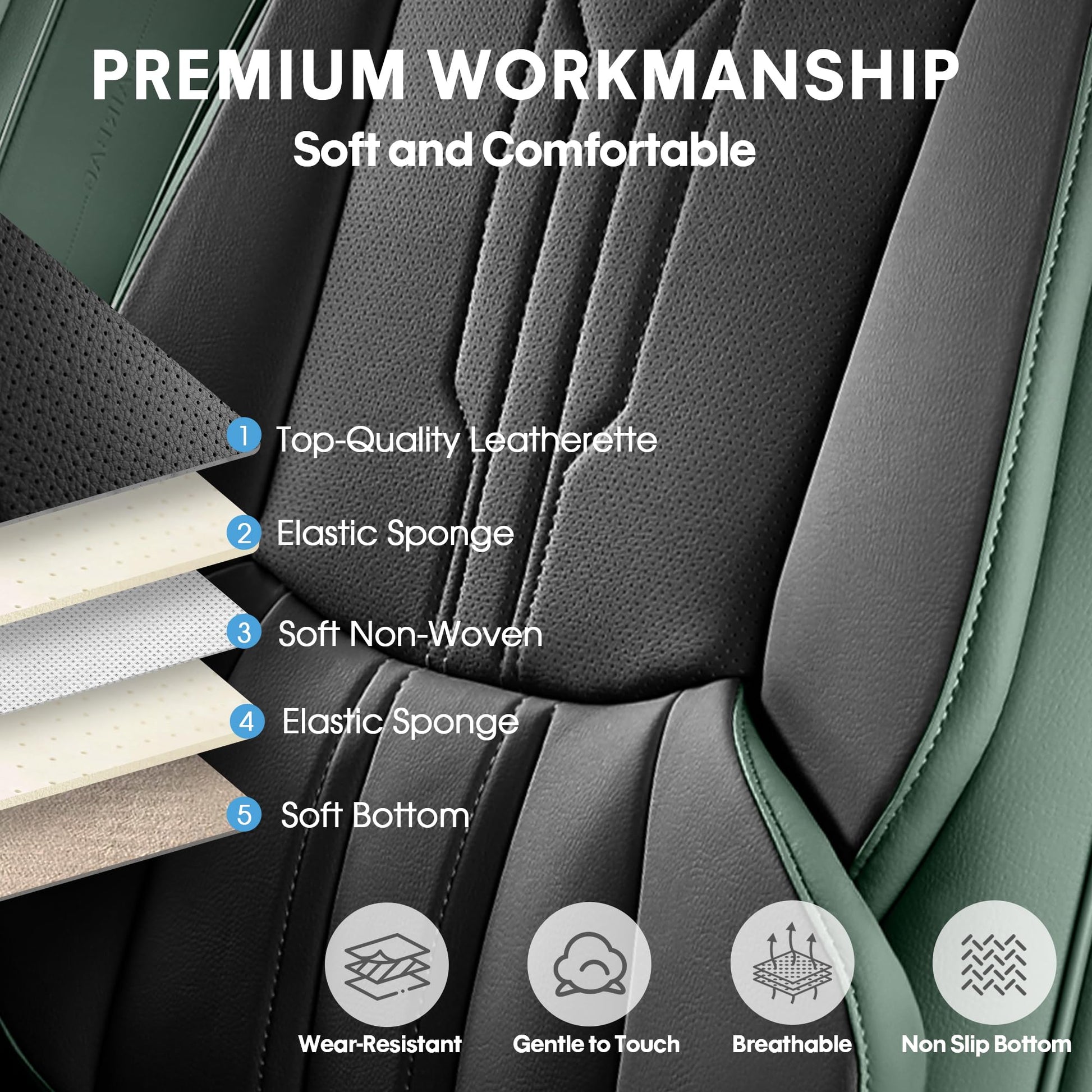 AOOG Car Seat Covers Full Set, Leather Seat Covers for Car, Waterproof Car Seat Protector with Lumbar Support, Automotive Seat Covers Universal Fit for Most Cars SUV Trucks (Full Set, Green&Black)