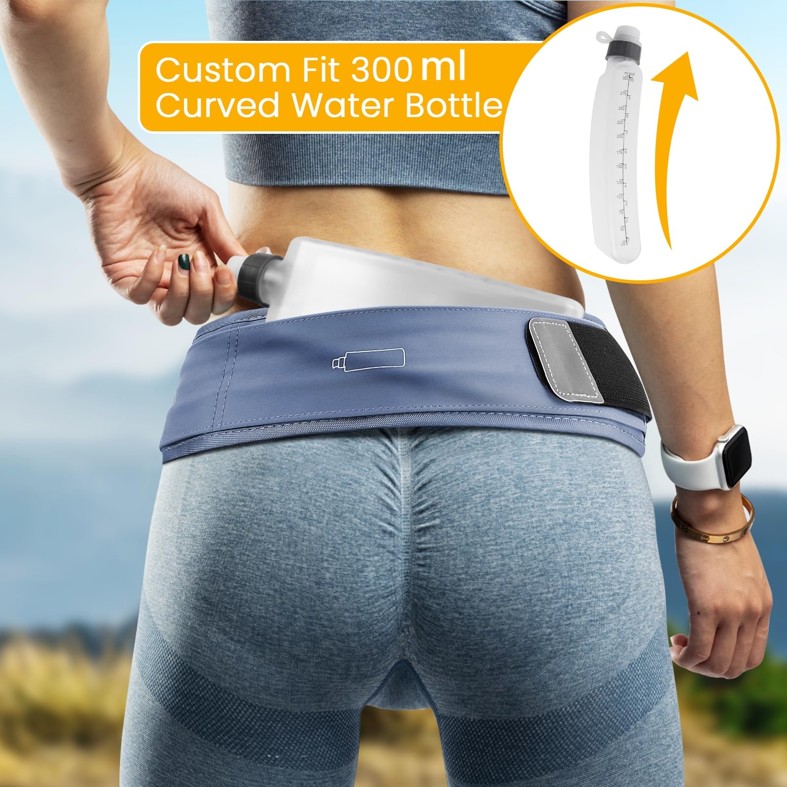 - Professional running belt: Designed specifically for running, the waist band with customized 300 ml curved water bottle. The curved design creates a more natural fit around a runner's body, making it easy for them to go hands-free and stay hydrated