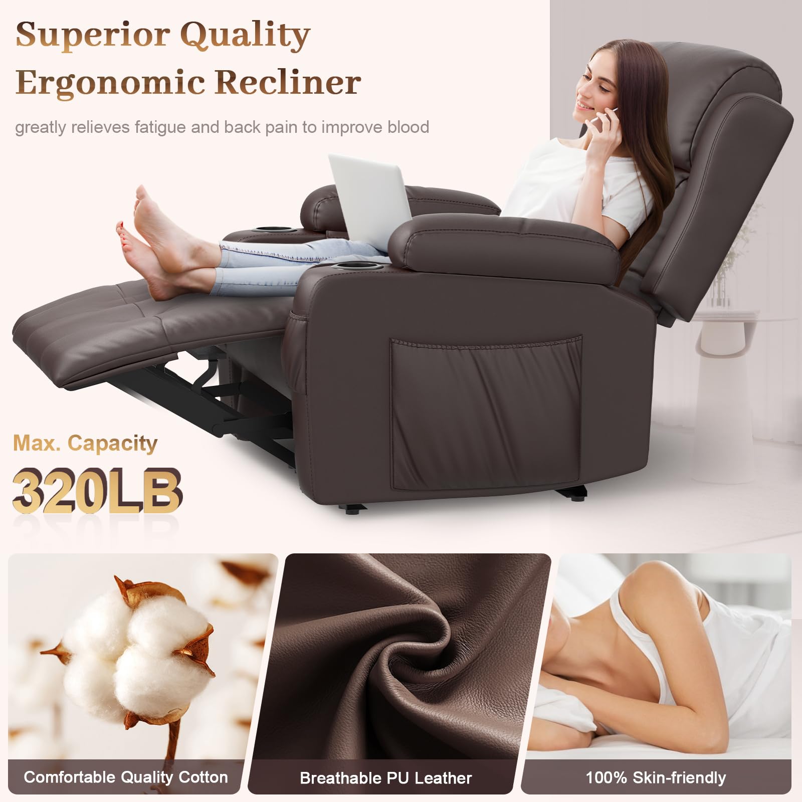 - Superior Quality Material Choice: Our recliner is crafted from 100% skin-friendly faux leather and padded with high-density memory foam, offering exceptional comfort and support while helping to reduce muscle fatigue and rejuvenate your spirit