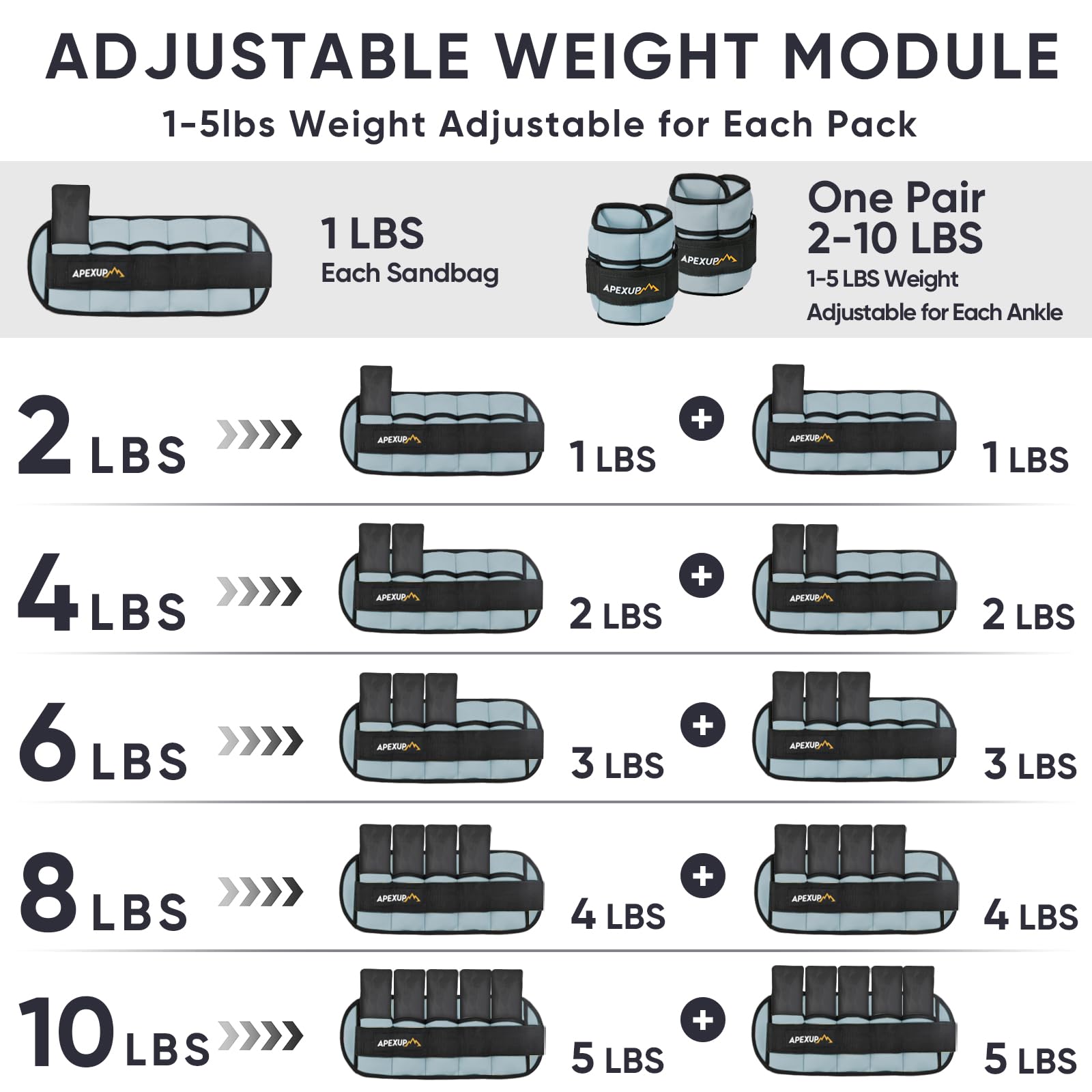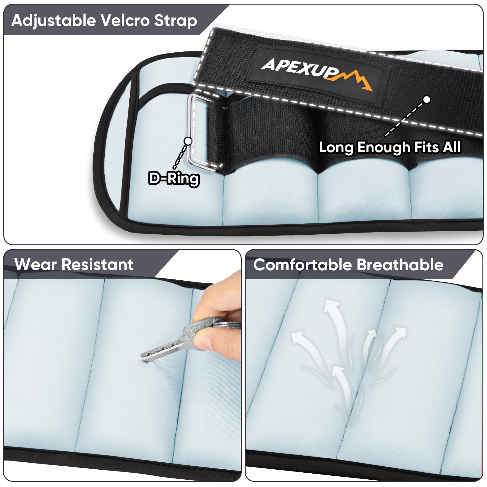 - [PREMIUM QUALITY] APEXUP adjustable ankle strength training weights are filled with iron sand to ensure a compact profile. The sleeve material of the ankle weights for men is soft and breathable, which will give you maximum comfort during workout.