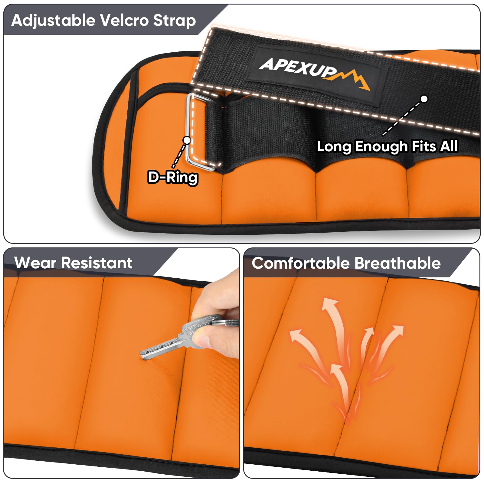 - [PREMIUM QUALITY] APEXUP adjustable ankle strength training weights are filled with iron sand to ensure a compact profile. The sleeve material of the ankle weights for men is soft and breathable, which will give you maximum comfort during workout.