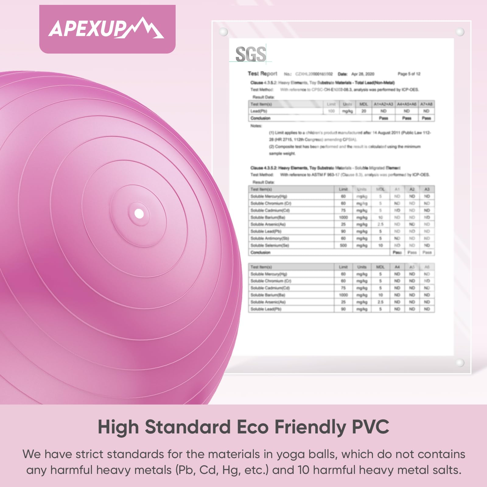 - [SAFE AND ANTI BURST] APEXUP Exercise ball is made of high-quality, eco-friendly PVC material, which meets stringent safety standards. It's non-toxic, odorless, and free from harmful heavy metals. With an anti-burst honeycomb structure, it ensures durability and safety during your workouts.