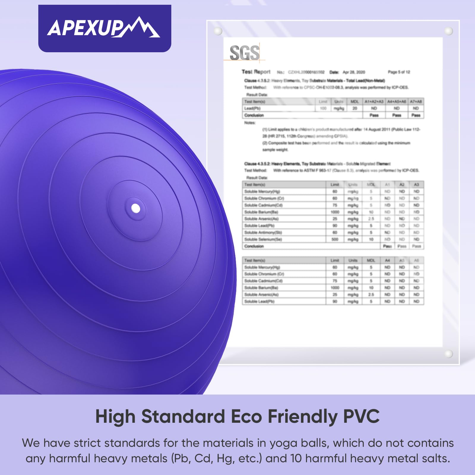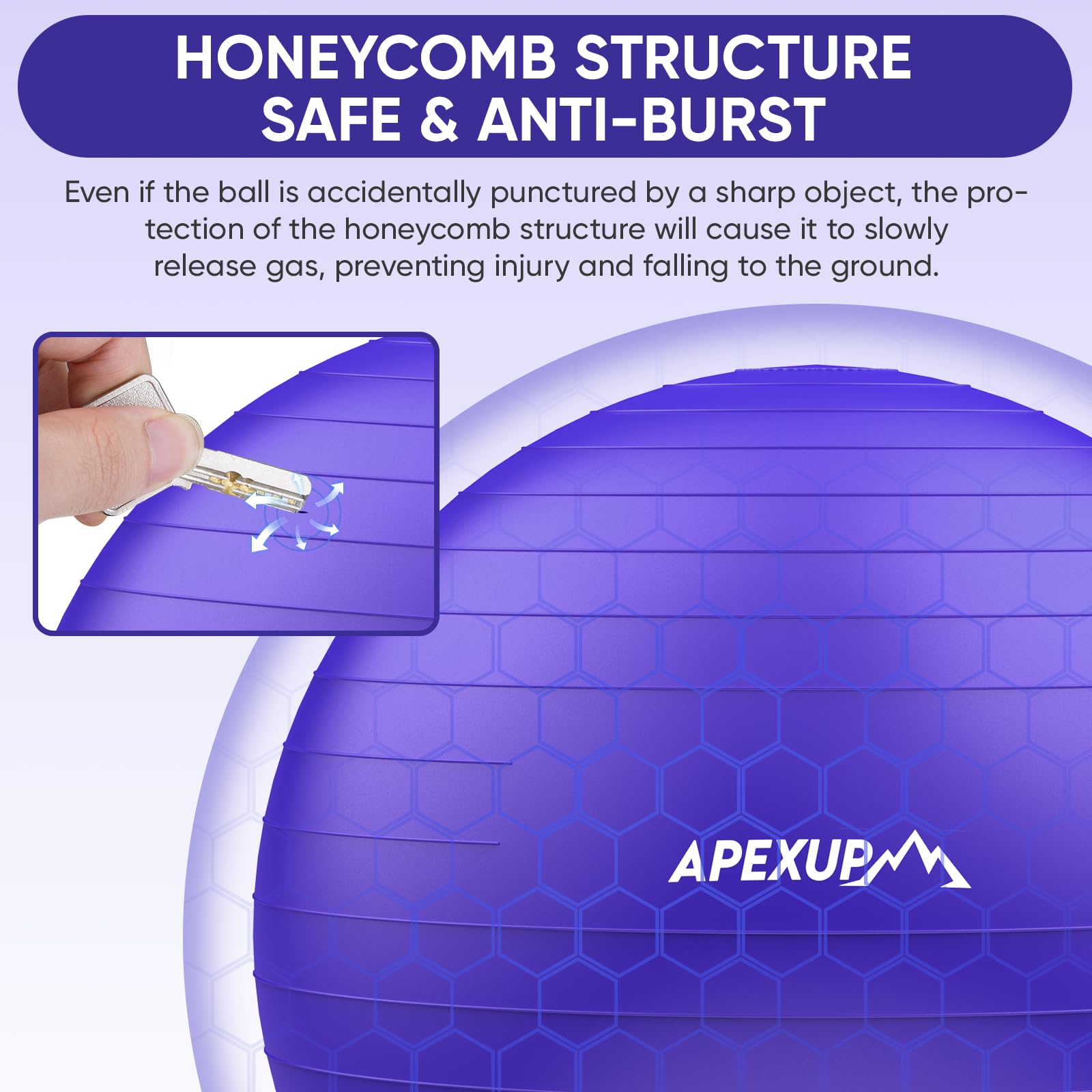 - [SAFE AND ANTI BURST] APEXUP Exercise ball is made of high-quality, eco-friendly PVC material, which meets stringent safety standards. It's non-toxic, odorless, and free from harmful heavy metals. With an anti-burst honeycomb structure, it ensures durability and safety during your workouts.