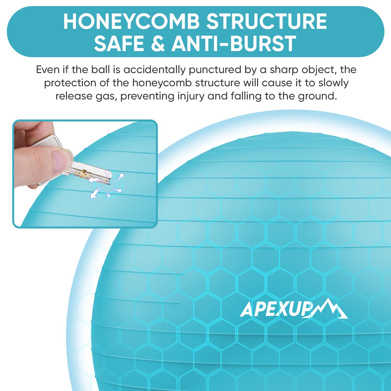 - [SAFE AND ANTI BURST] APEXUP Exercise ball is made of high-quality, eco-friendly PVC material, which meets stringent safety standards. It's non-toxic, odorless, and free from harmful heavy metals. With an anti-burst honeycomb structure, it ensures durability and safety during your workouts.