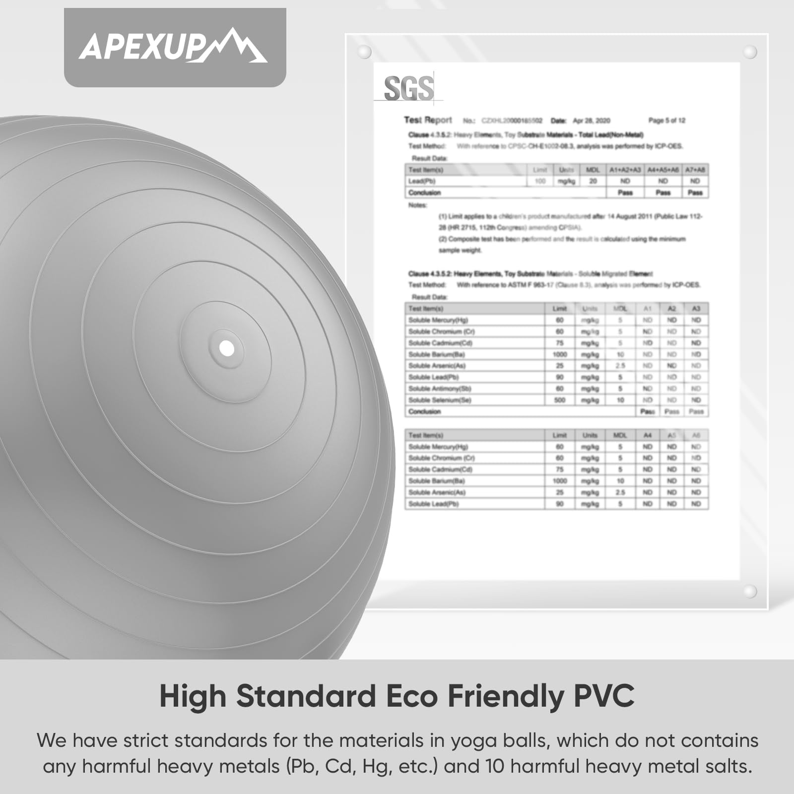 - [SAFE AND ANTI BURST] APEXUP Exercise ball is made of high-quality, eco-friendly PVC material, which meets stringent safety standards. It's non-toxic, odorless, and free from harmful heavy metals. With an anti-burst honeycomb structure, it ensures durability and safety during your workouts.