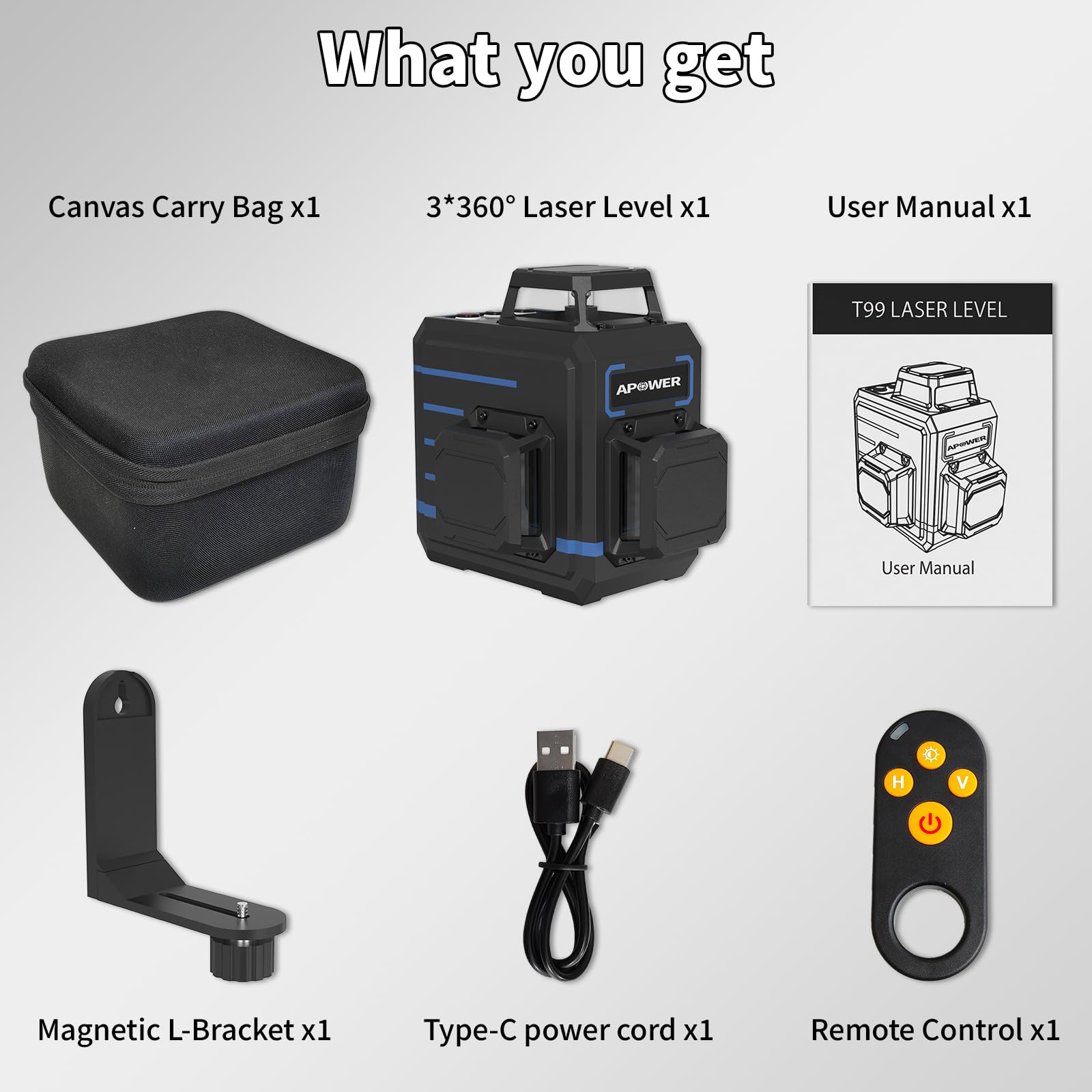 - What You Get: 1x 3*360°laser level, 1x Type-C power cord, 1x Magnetic L-Bracket, 1x Remote Control, 1x user manual, and 1x Canvas Carry Bag. We stand behind our products and provide 24-hour customer service. If you have any question or issue on our products, and we promise a nice solution to you. Thanks