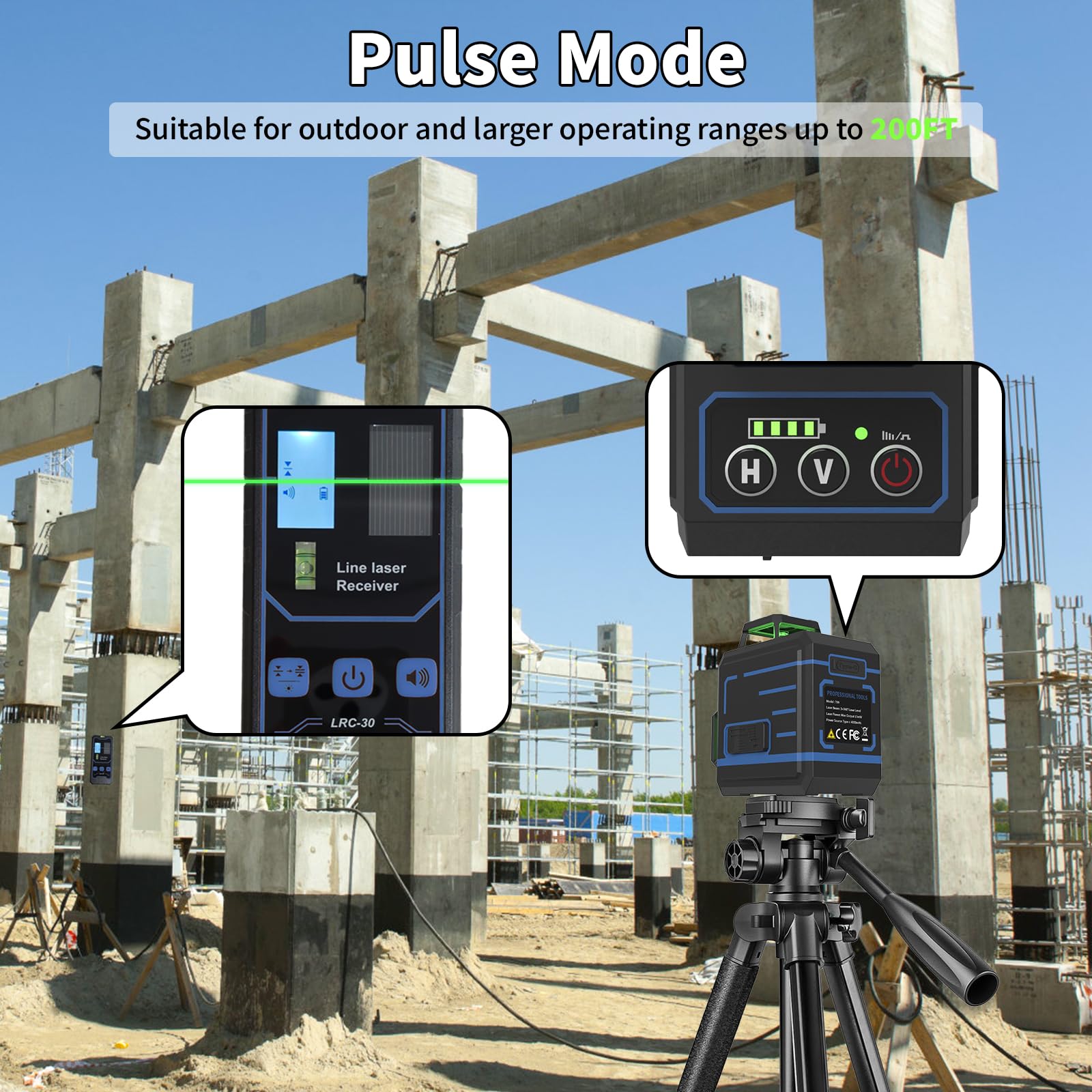 - 3x 360°Laser Level & Pulse Mode: The APOWER laser level can cover all around the room with one 360° horizontal and two 360° vertical lines. You can easily turn on/off any laser line with H & V button on the keypad. The green laser level has a working range up to 100Ft of accuracy ±1/9' at 33 Feet. The Outdoor Pulse Mode can extend the range up to 200 feet with Laser Receiver. It is necessary to use with receiver when work in bright-light conditions or outdoors