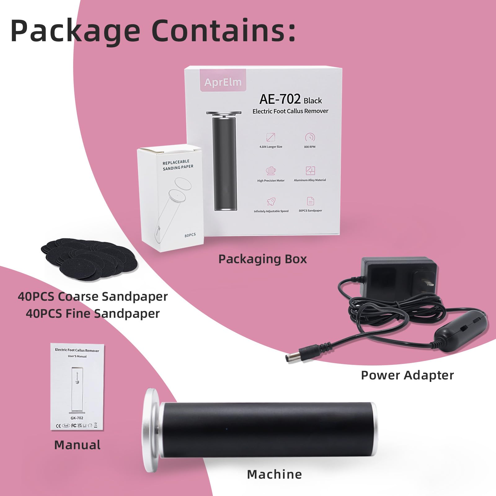 AprElm 4.8IN Longer Electric Foot Callus Remover, Professional Aluminum Callus Remover for Feet with 80pcs Sandpaper Discs, Stepless Speed Control Pedicure Tools for Dead Skin Calluses (Dark Black)