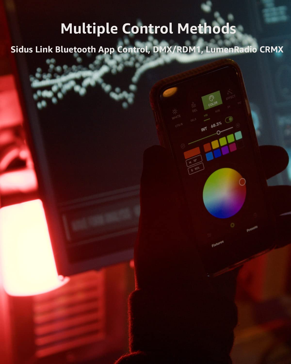 - Multiple Control Methods: Sidus Link Bluetooth app, DMX/RDM1, and built-in effects (15 pre-set and customizable), it also features a rechargeable lithium-polymer battery for 120 minutes of runtime at max power and fast charging via USB-C.