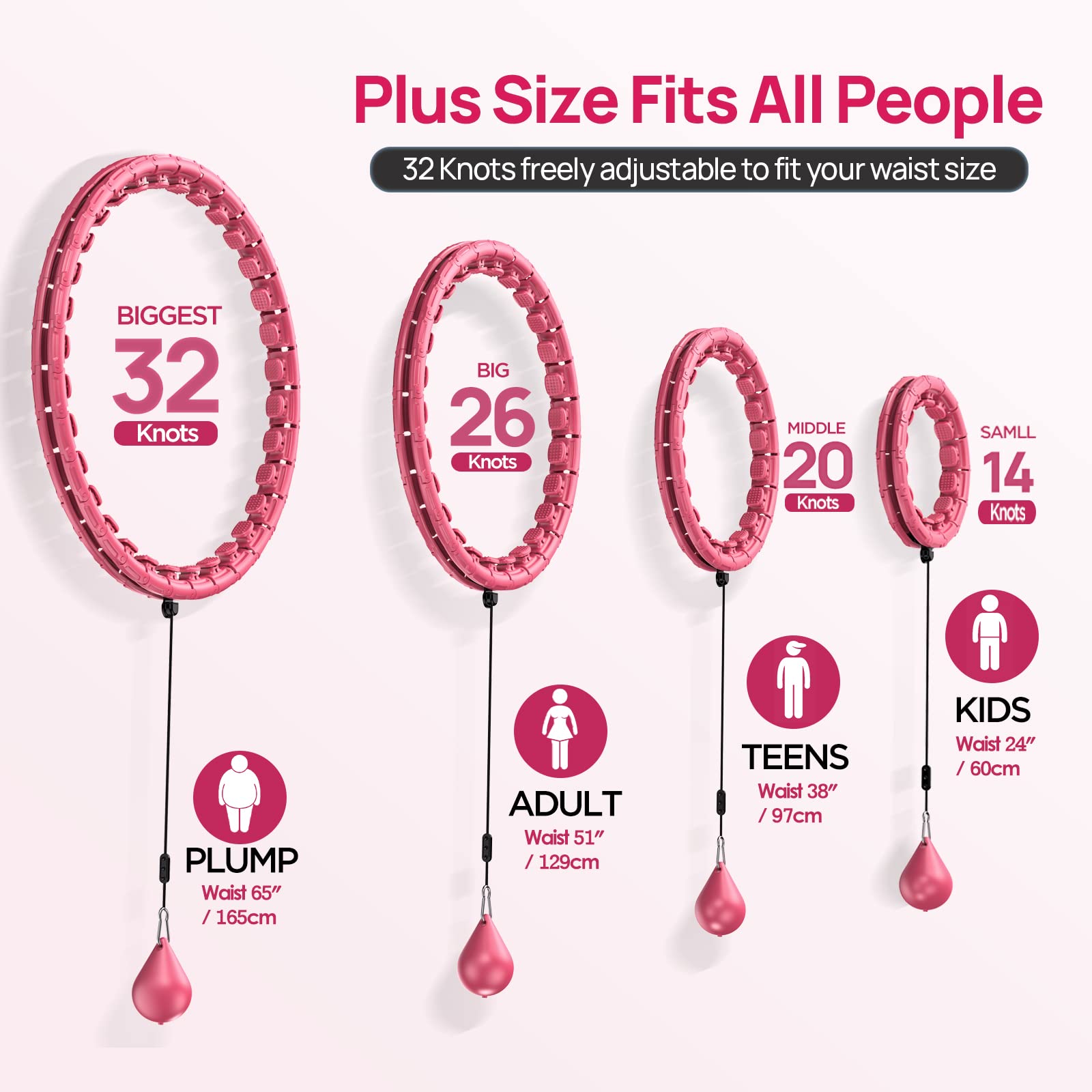 - đăPlus Size 32 Knots / 65inches for All Waist Sizesă-- Our APzek smart Exercise Hoop is designed to be available for the whole family - consisting of 32 detachable parts. You can easily add or remove links to match your waist size. The weighted hoop can be adjusted from 14sections to 32sections, Appropriate waist size is 24inches/60cm - 65inches/165cm, which surely fits all sizes and shapes. Get rid of the worry of insufficient size now~