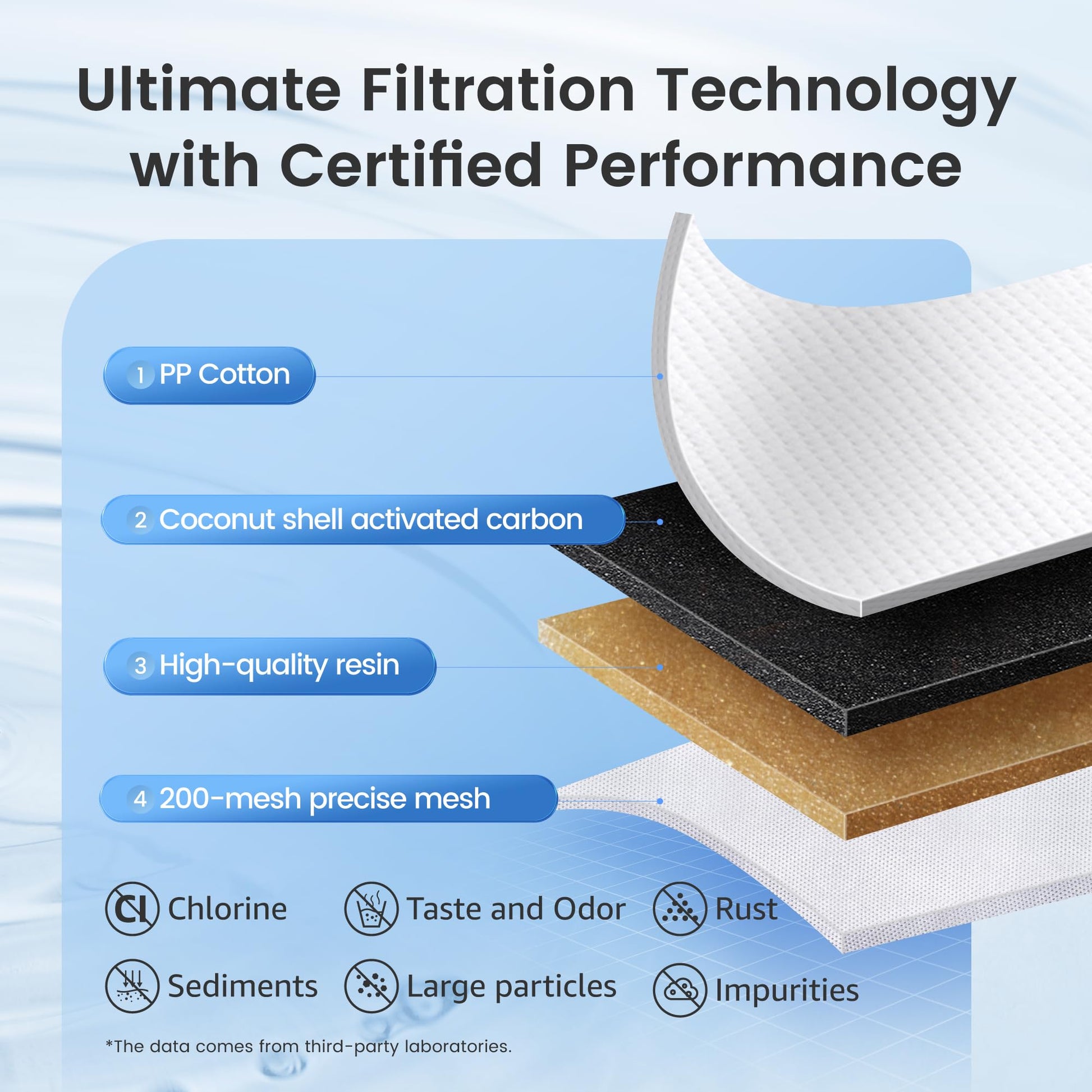 - [4-stage Filtration] This filter adopts a pre-filter layer with coconut shell activated carbon and high-quality ion-exchange resin to ensure the maximum filtration and clean water possible. Tested by a third-party lab, it can efficiently reduce chlorine, rust, taste and odor, and sediments.This filter DOES NOT lower TDS value.