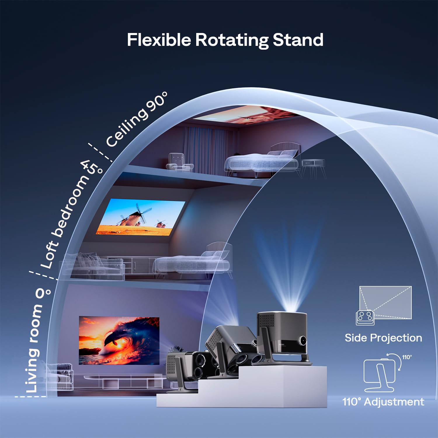 - Projector for Bedroom - 360° Visible Sound & DoIby Audio: 20W high-power speakers with DoIby Audio bring cinema-grade sound to life. The rear-facing Visible Sound design delivers deep bass and crisp highs, turning every movie night into an auditory delight.