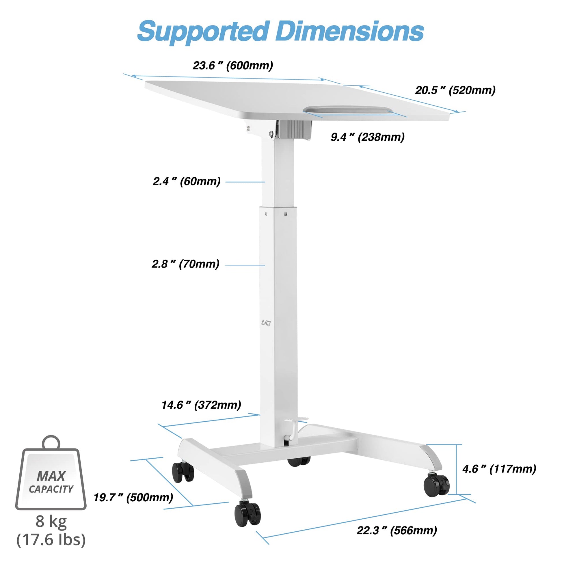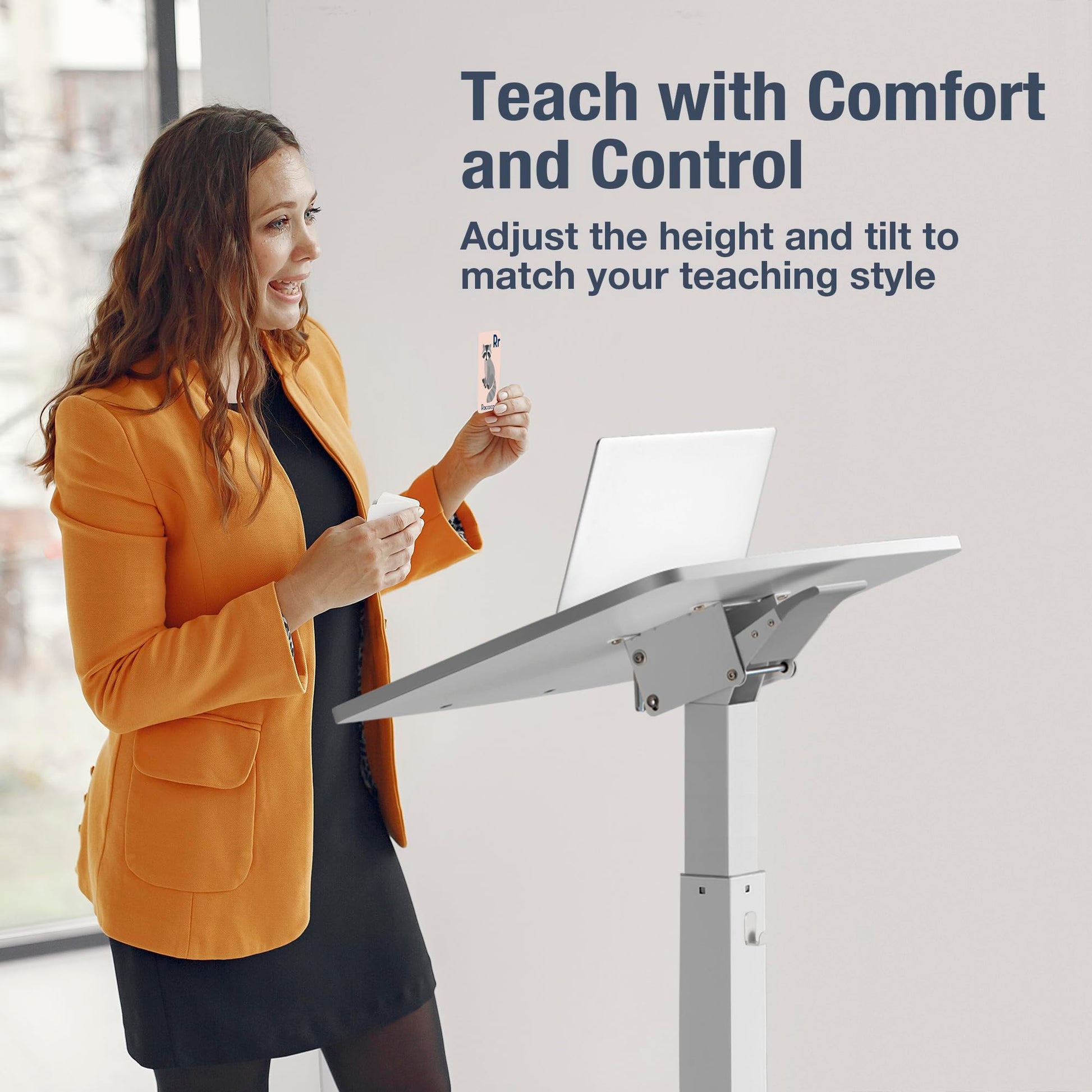 - MULTI-FUNCTIONAL - Effortlessly raise and lower the desk from 32.3” to 46.9” to convert between a highly effective mobile lecture for speaking in front of a group or a mobile laptop workstation to use while sitting.