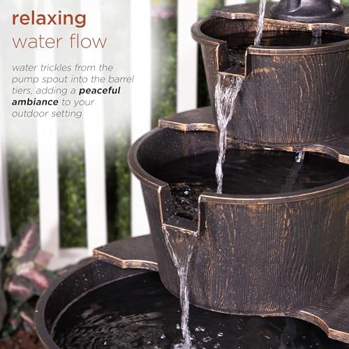 - RELAXING WATER FLOW: Water trickles from the pump spout into the barrel tiers, adding a peaceful ambiance to your outdoor setting