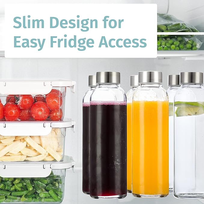 Glass Water Bottles 6 Pack With Sleeves and Stainless Steel Lids - 18oz Size - Leak Proof Caps, Reusable and Perfect For Travel and Storing Beverages Juice, Smoothies, Kombucha, Kefir, Tea
