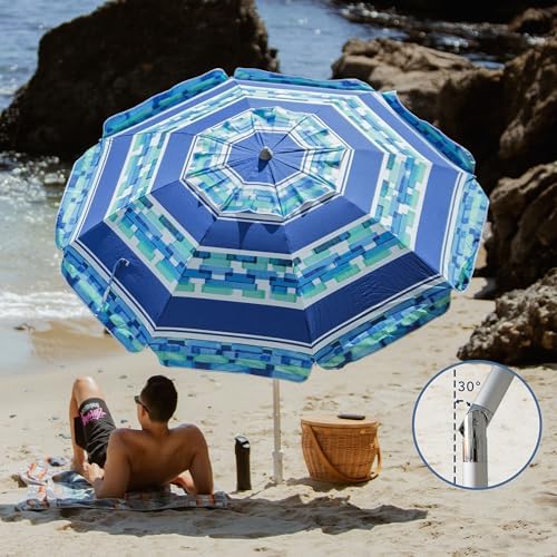 AMMSUN 7ft Heavy Duty Windproof Portable Beach Umbrella with Sand Anchor Vent Adjustable Height with Tilt Aluminum Pole, Portable UV 50+ Protection Carry Bag for Patio Garden Beach Pool Backyard