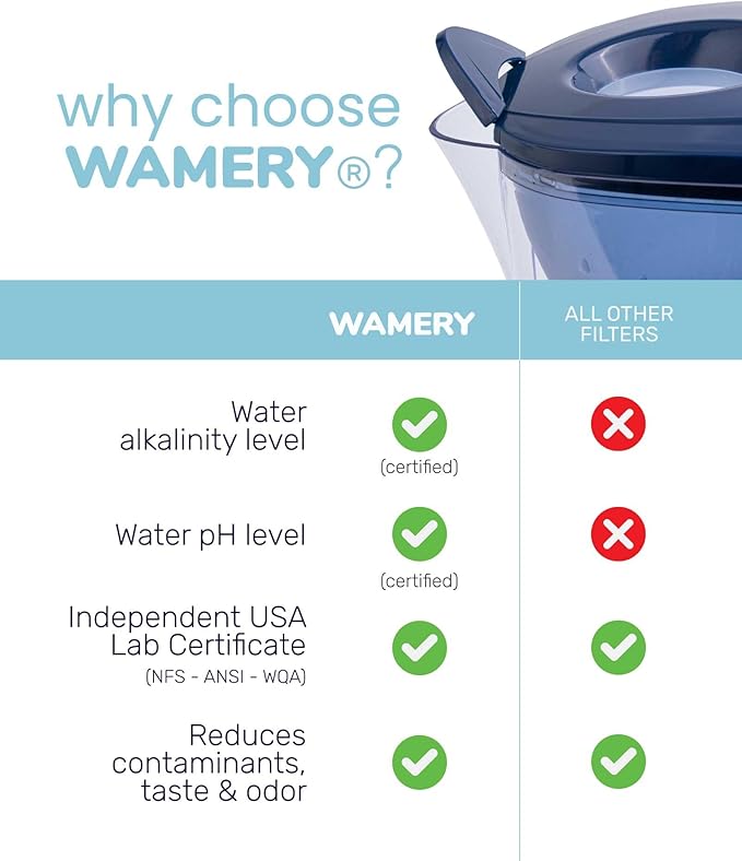- 💧 START A HEALTHY LIFE TODAY: Wamery alkaline water pitcher filter system may increase alkalinity water pH level up to 9 points. It also reduces contaminants in the water such as arsenic, chlorine, zinc, copper, mercury, cadmium and lead, matching NSF/ANSI standards. Save money and forget about alkaline water bottles.