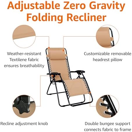 Amazon Basics Outdoor Patio Zero Gravity Lounge Chair with Pillow, Folding Reclining and Textilene Adjustable, Folding Lounge Lawn Chairs for Outside, 26", Beige