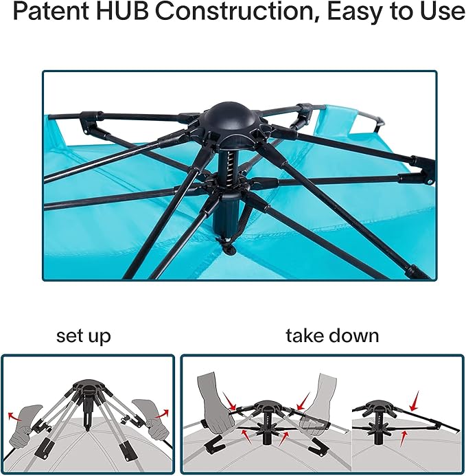 - ☀SUPER EASY UP & DOWN: This beach tent sun shelter pop up automatically instant in a second. Sets up less than 30 seconds. Folds down handy, with 2 hands clasp top two poles, into roomy portable carrying bag, no need to struggle with this foldable tent.