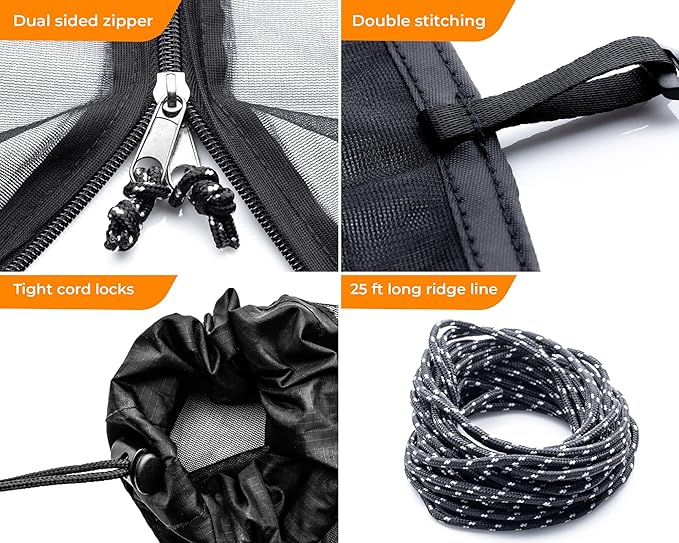 • SIMPLE SET UP: Foxelli Hammock Net comes complete with everything you’ll need to easily set up your hammock net cover in just seconds. An extra-long ridgeline is included (25 feet), as well as a convenient dual sided vertical zipper for easy in and out access, which are all must have accessories for any hammock camping set.
