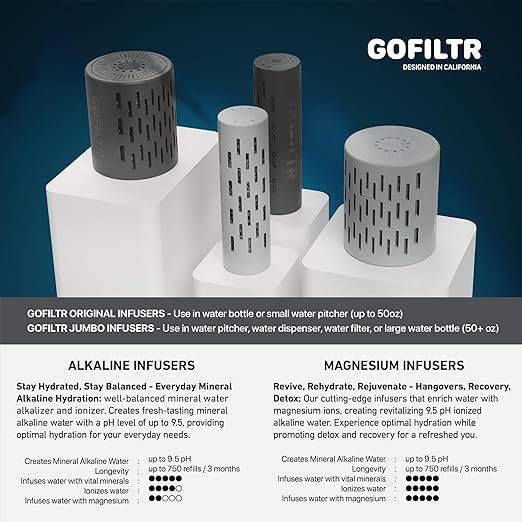 - CREATE 9.5-PH MINERAL IONIZED ALKALINE WATER IN MINUTES - GOFILTR will mineralize, ionize, alkalize and transform your regular water into a refreshing mineral ionized alkaline water in just a few minutes, whether it's purified or tap. Each infuser is designed to last up to 3 months or 750 refills, increasing the pH up to 9.5.
