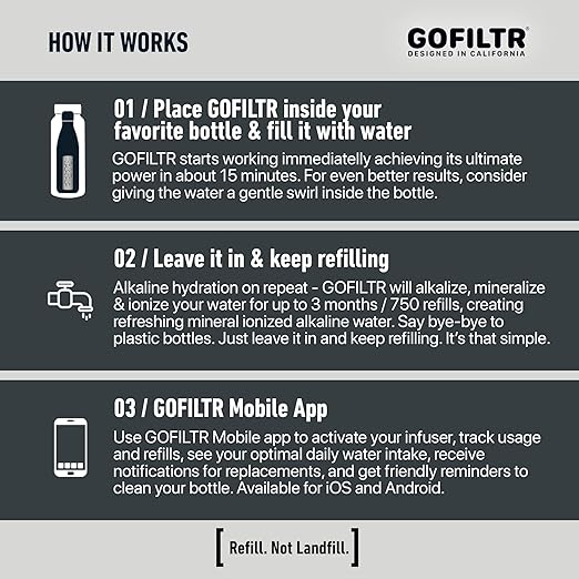 - GOFILTR MOBILE APP - Use the GOFILTR Mobile App to activate your infuser, track usage and refills, see your optimal daily water intake, receive replacement notifications, and get friendly reminders to clean your bottle.
