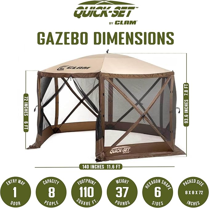 CLAM Pop Up Screen Tent & Shelter, Outdoor Camping Gazebo w/ 6 Wind Panels, 11.5', Brown
