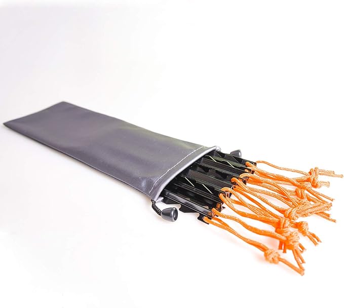 - Package Content: 12Pcs tent pegs with reflective pull cords + 1pcs carrying pouch;