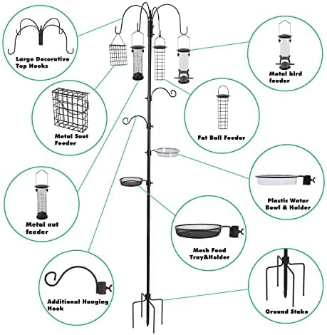 - Bird Feeding Station Kit With Hooks & Trays: Bird feeder pole comes with 4 large top level hooks which are ideal for hanging longer and larger feeders and is followed by two additional hooks which are completely adjustable anywhere on bird feeder pole and effective for hanging smaller feeders and attracting birds. Wire mesh tray is great for mealworms, nuggets, suet, fruit, even seed mixes and plastic water bowl included in the box is ideal for birdbath