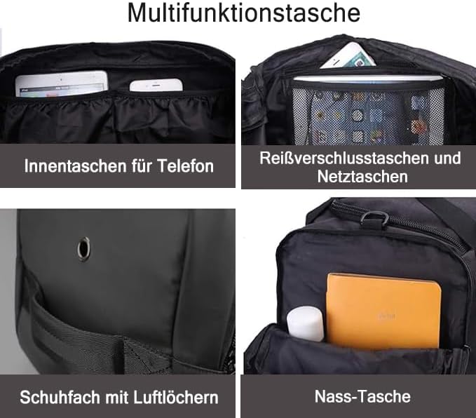 - 【Multi Compartment】The size of the gym bag ,is 21.5"L 10.5"W 10.0"H (Capacity :40L). this duffle bag can meet the needs of fitness and travel (clothes for two people for a weekend). This weekender bag has 8 pockets, including five outer pockets and four inside pockets.The measuring maximum load of this gym bag is 110lb 50kg