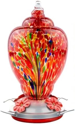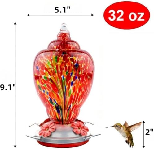 WOSIBO Hummingbird Feeder for Outdoors Patio Large 32 Ounces Colorful Hand Blown Glass Hummingbird Feeder with Ant Moat Hanging Hook, Rope, Brush and Service Card (RED-Firework)