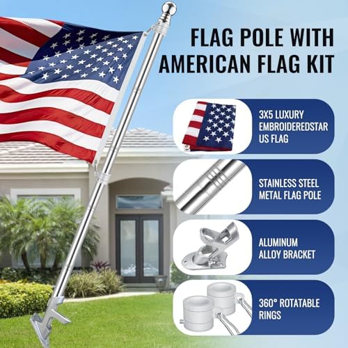 - 【EVERYTHING YOU NEED】You do not need spend time in finding the correct size of flag pole or bracket for your American flag. It comes with flag set you need, include 6 feet sectional flagpole, pole bracket and 3x5 feet polyester US Flag. It is easy to install the flagpole set on your wall with included 4pcs plastic anchor and screws kit.