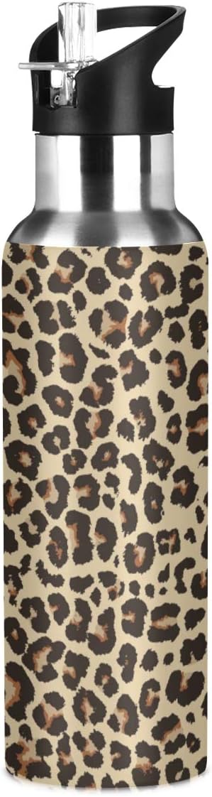 Leopard Water Bottle with Straw Lid for Fitness Gym Camping Outdoor Sports, Wide Mouth Vacuum Insulated 18/8 Stainless Steel, 22 oz