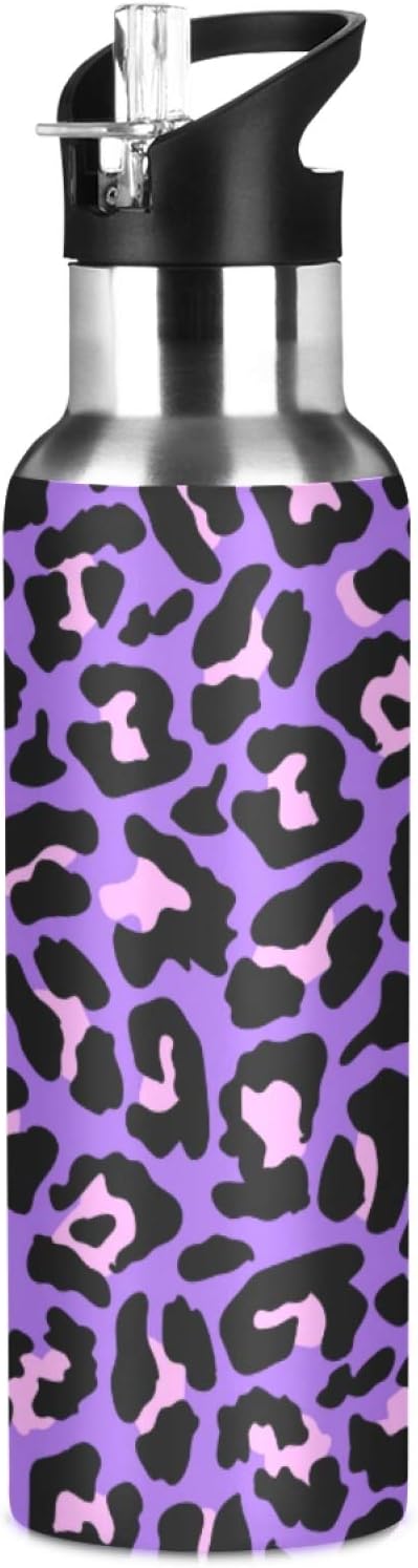 Qilmy Black and White Leopard Water Bottle Vacuum Insulated Stainless Steel Water Bottles with Straw Lid Leakproof Wide Mouth Water Flask for Fitness Outdoor Sports, 20 oz