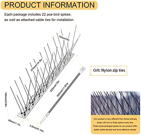 - Full Width Coverage: The length of each spike is 4 in (100mm) and the width is 3 in (76mm). Unlike products with only 2 or 3 spikes, our bird control spikes have a total of 6 needles in each group of needles in the horizontal and vertical directions, which can better cover the entire 360° range