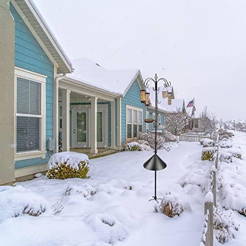 - Double W Hooks Bird feeding Station with Squirrel Baffle :Our Bird feeders with stand for outside has the 94 inches in height. With a high height, the bird feeder poles for outdoors might be seen by more birds. The bronze shape is suitable for various environments. More important, the bird feeders for outside with pole is easy to install. One person can complete the assembly. The position of two small hooks and two round feeders can be adjusted freely.