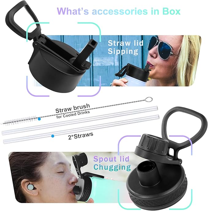- 4. Water Bottle with Straw / Spout Lids: Akyta Water Bottles, comes with 2 lids,to serve all your needs, Straw lid, and spout lid, Leak-Proof, Splash resistant, the insulated bottle also comes with 2pcs straws and 1pc brush for cleaning straw