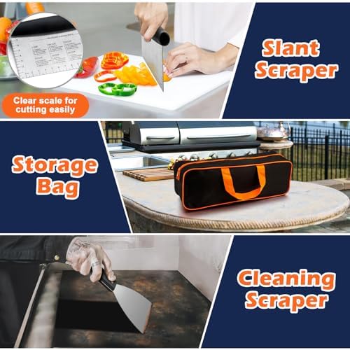 - 【SUPER VALUE SET】 Package included: Carrying Bag, 2 Melting Dome, Burger Turner, Long Griddle Spatula, Perforation Spatula, Metal Spatula, Griddle Flipper, Griddle Scraper, Griddle Press, Plastic Burger Press, Pepper Mill, 2 Egg Rings, 2 Squeeze Bottles, Scourer, Small Screwdriver, This professional griddle accessories set will meet most cooking needs, ideal for Outdoor BBQ, Teppanyaki, Burger making, etc. A wonderful gift on Father’s Day, Thanksgiving Day, Christmas