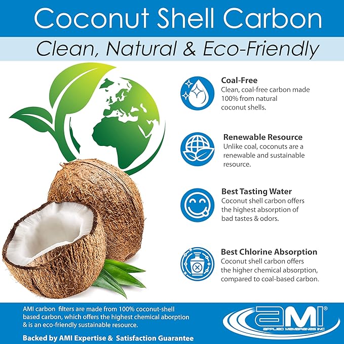 - CHARCOAL-FREE, PLANET-FRIENDLY CARBON: Each carbon filter is made from coconut shell carbon, a sustainable, renewable resource that works better than charcoal at removing bad odors and chemicals from your water.