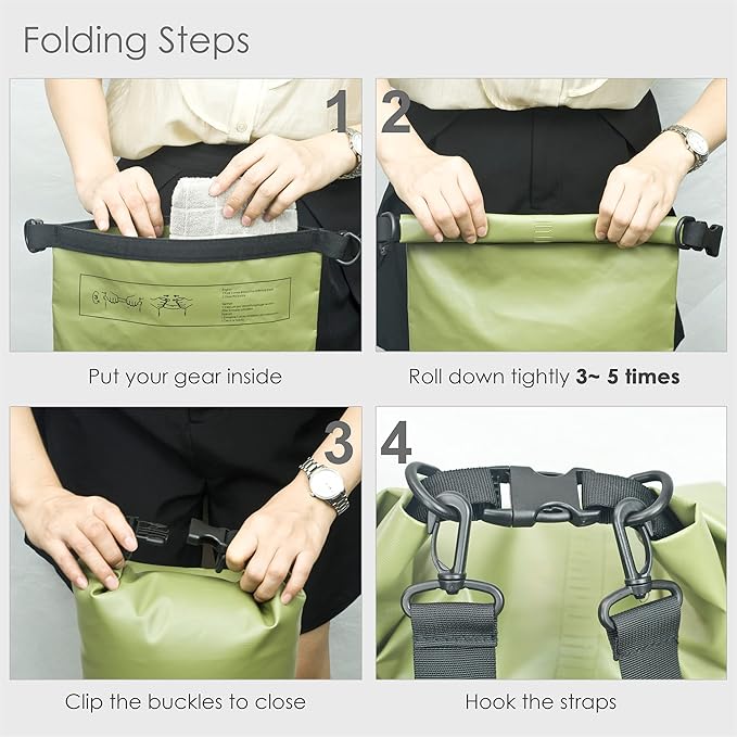 - 【EASY TO USE】 Just put your gear in bag, grab top woven tape and roll down tightly 3 to 5 times and then plug buckle to complete seal, whole process is very easy and quick. In order to help your bag float on the water better, be sure to leave some extra room for the air.
