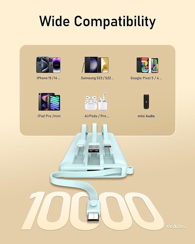 - [ Portable charger with Built in Cables ] This 10000mAh portable phone charger features built-in iPhone, USB C, and USB-Micro cables, eliminating the need to carry extra charging cables. Compatible with iPhone 15/14/13/12/11/XR/8/7, iPad, and Samsung Galaxy S20/S21/S22/S23, tablet, and other android devices. Also compatible with 5V/2A input heated Vest, heated Jacket and other heated clothing