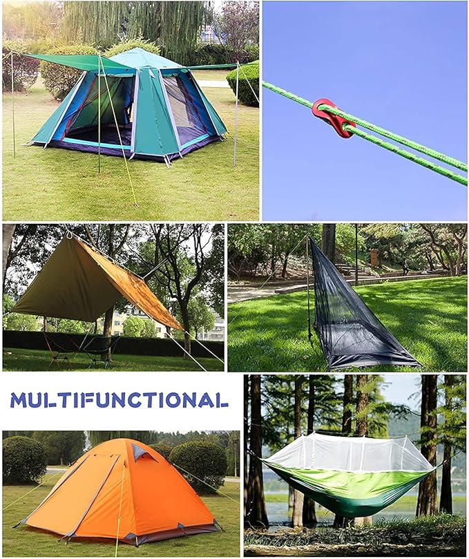 - 🌳ALUMINUM TENSIONER: Come with 6pcs aluminum tensioners , allow for easy and sturdy adjustments, widely used for tent rope connection and length adjustment.