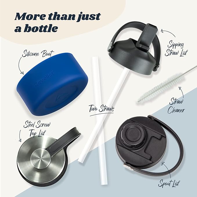 - GREAT VALUE: Every Revelist 32 oz water bottle comes with THREE different 100% LEAK PROOF lids - Straw Lid with 2 Straws, Flip Top Spout Lid and Stainless Steel Screw Top Lid - along with protective silicon boot and straw cleaner.