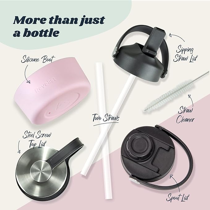 - GREAT VALUE: Every Revelist 32 oz water bottle comes with THREE different 100% LEAK PROOF lids - Straw Lid with 2 Straws, Flip Top Spout Lid and Stainless Steel Screw Top Lid - along with protective silicon boot and straw cleaner.
