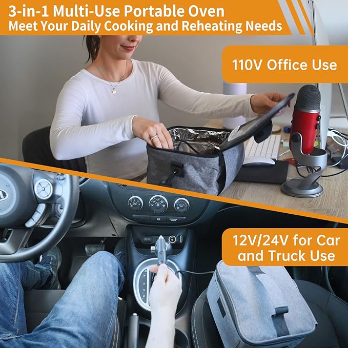 - ✅ NO MONITORING REQUIRED W/AUTOMATIC TEMP CONTROL: This self heating portable oven for your car, truck and office work will cook, reheat fresh, or frozen meals evenly and without burning, overcooking, or producing bad odors. Easily cook meals on the go or at your office by simply placing your meal inside and plugging it in this car food warmer.