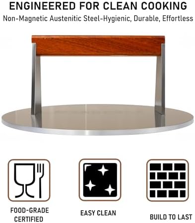 - SAFETY FIRST IN THE KITCHEN: Our griddle press features an extended anti-rotation wooden handle, keeping you cool and safe even during long cooking sessions