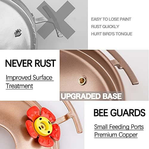 - 【Leakproof and SAFER Feeder Ports】The metal base is equipped with sealing ring and plastic basin for leakproof. UPGRADED feeder ports are made with premium copper materials, no sharp edges will cut or catch the hummingbirds' tongue. Make sure the gasket is securely attached before you hanging the hummingbird feeders outside.