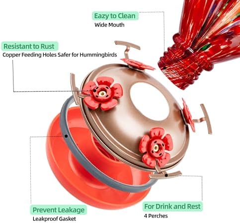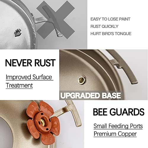 - 【Leakproof and SAFER Feeder Ports】The metal base is equipped with sealing ring and plastic basin for leakproof. UPGRADED feeder ports are made with premium copper materials, no sharp edges will cut or catch the hummingbirds' tongue. Make sure the gasket is securely attached before you hanging the hummingbird feeders outside.