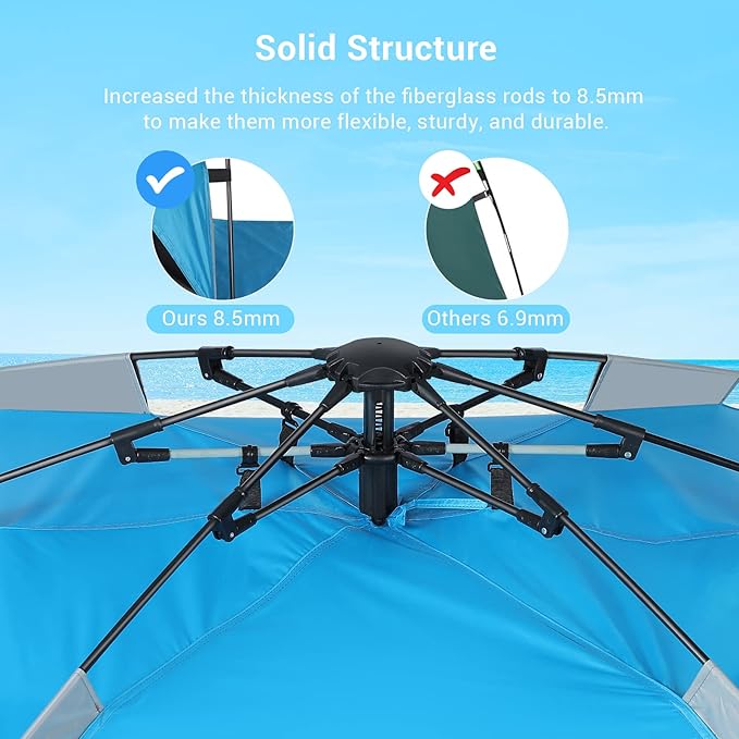 - 【Solid Structure】8.5mm Thickened Fiberglass Rods automatic bracket structure instant setup in seconds. Time-saving reduces effort. We increased the thickness of the fiberglass rods to 8.5mm to make them more flexible, sturdy, and durable. It can support the tent more stable and will keep its shape even after a long time of use