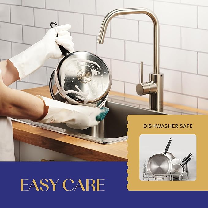 - EASY TO CLEAN & CARE FOR. To maintain the quality of your Legend cookware, allow to cool completely to room temperature. Clean with dish detergent and a sponge or soft mesh scrubber. To maintain luster, polish with water or baking soda and a mild acid, like vinegar or lemon juice. Dishwasher safe, but handwashing is best. Stainless steel copper core pots & pans require no special handling, unlike cast iron, pure copperware, enameled and nonstick clad cookware.